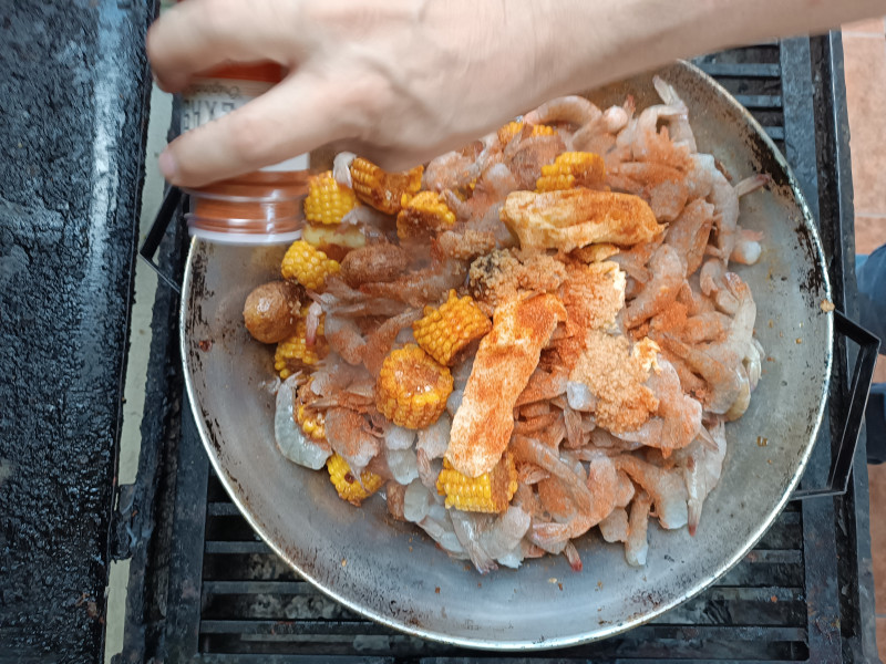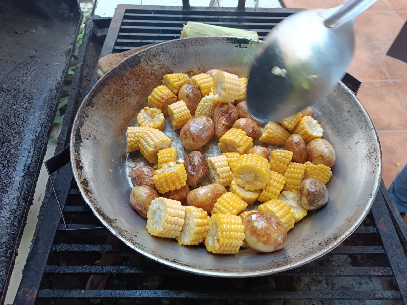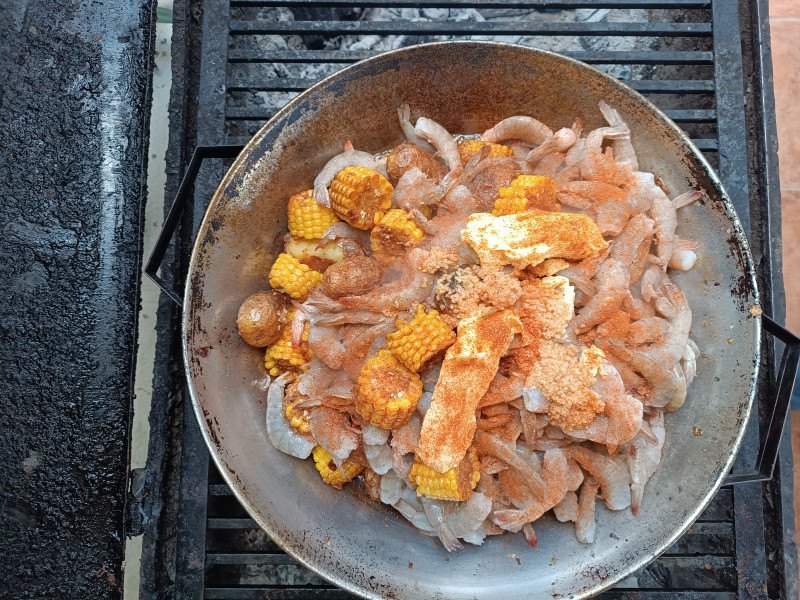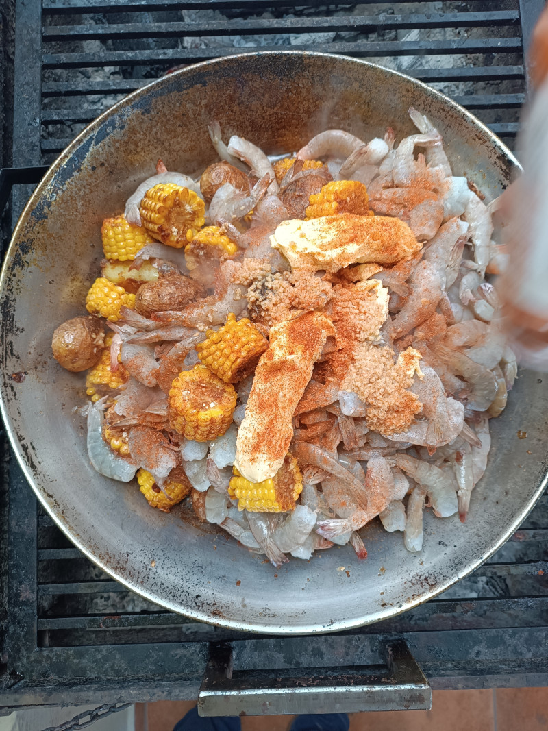 Aceite de oliva 🫒 al sartén, después incluyes las papas, posterior mente agregas el elote. Una ves que ya se vea que están a medio cocer agregas los camarones y agregas las barras de mantequilla 🧈 y le colocas el sazonador cajun.