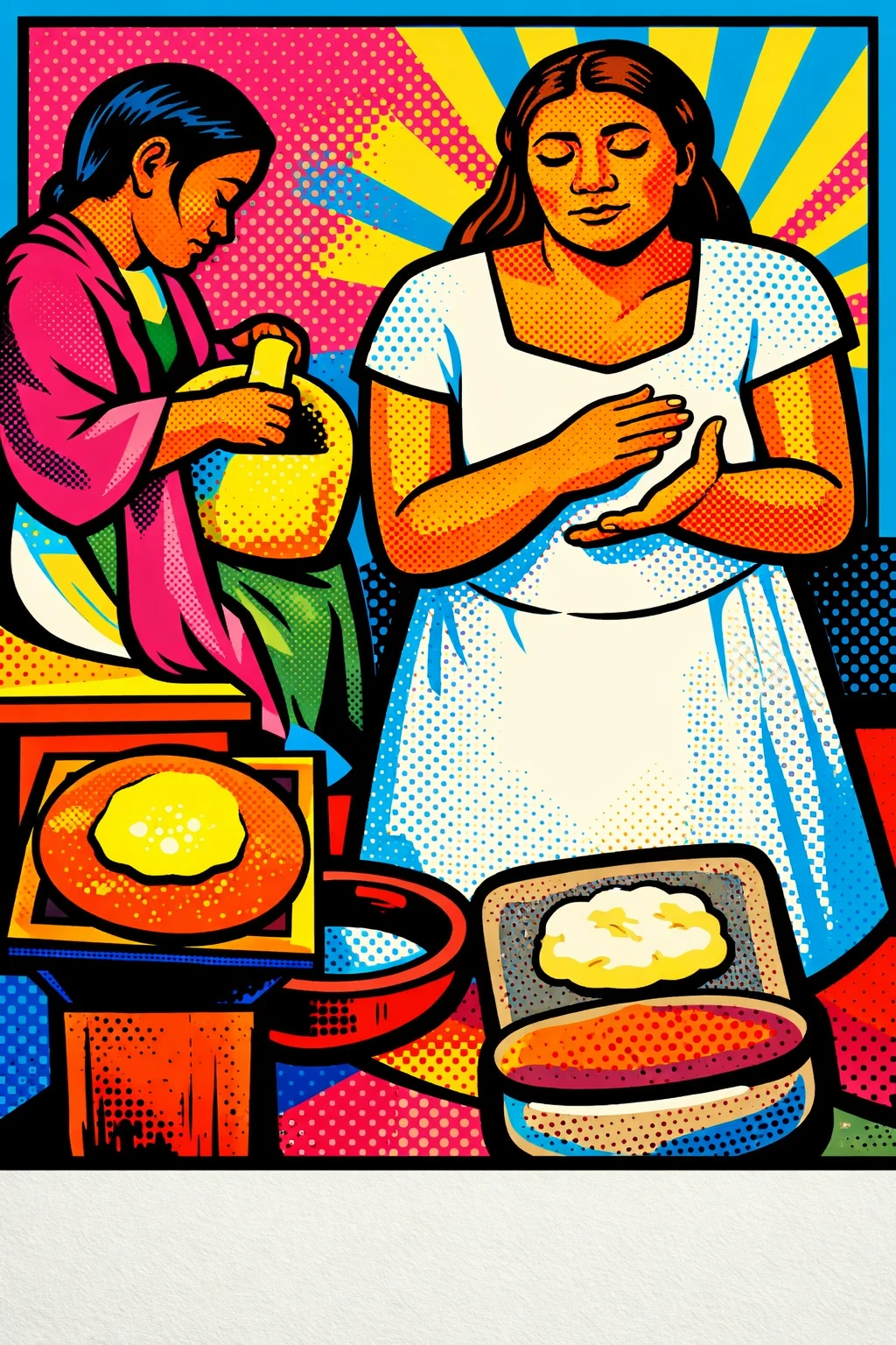 El uso del color blanco en su vestimenta resalta sobre los tonos tierra del fondo, simbolizando una pureza que no tiene que ver con la riqueza, sino con la integridad del trabajo. A su lado, la presencia de la niña sugiere la transmisión de este conocimiento de generación en generación, un ciclo infinito de nutrición y cultura.